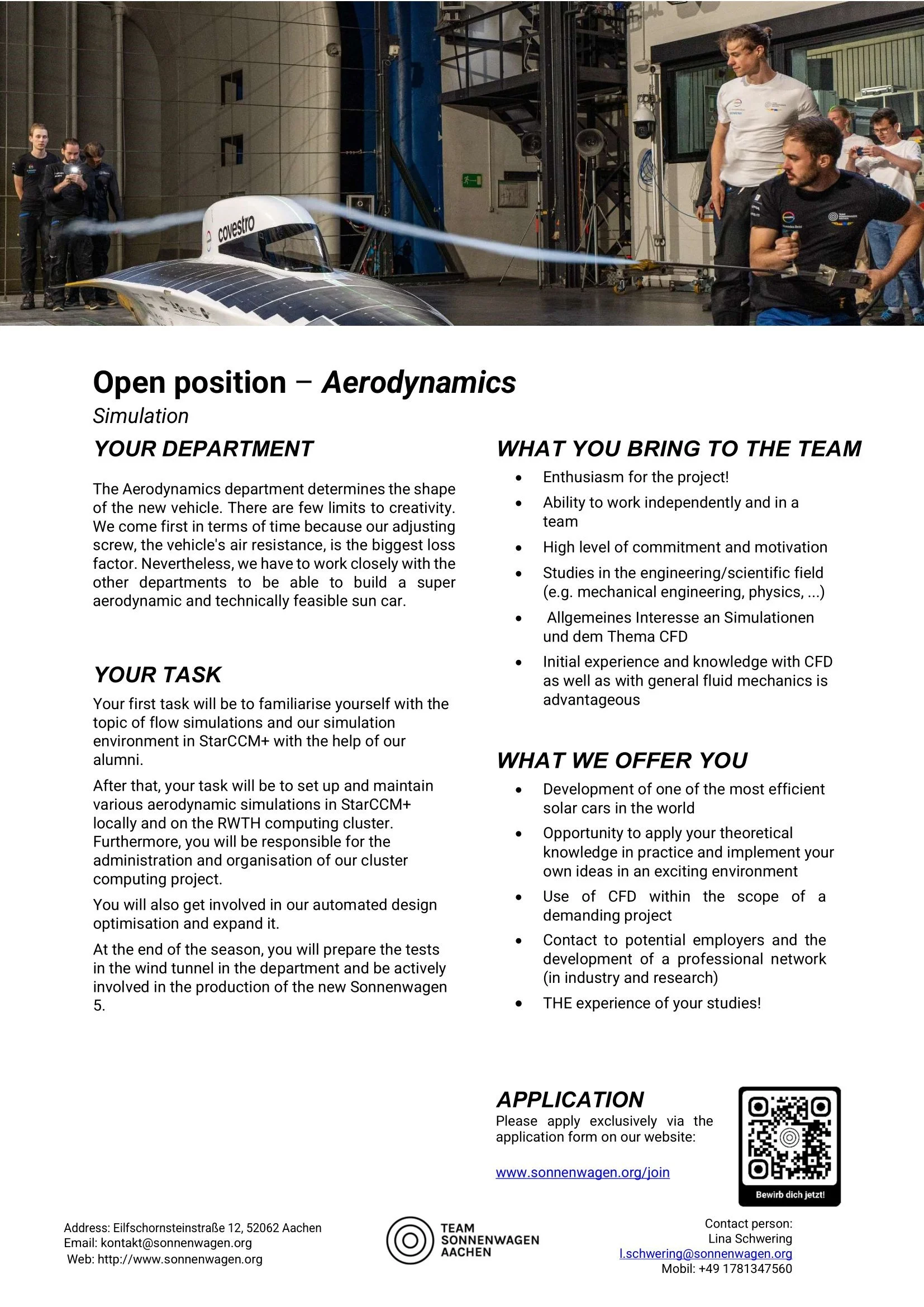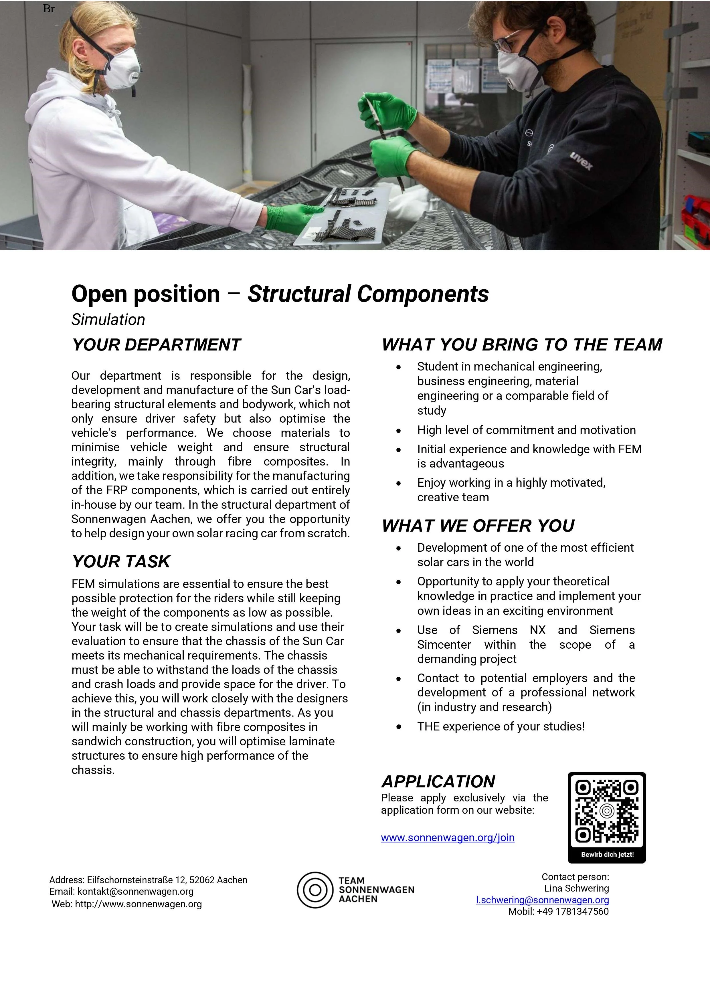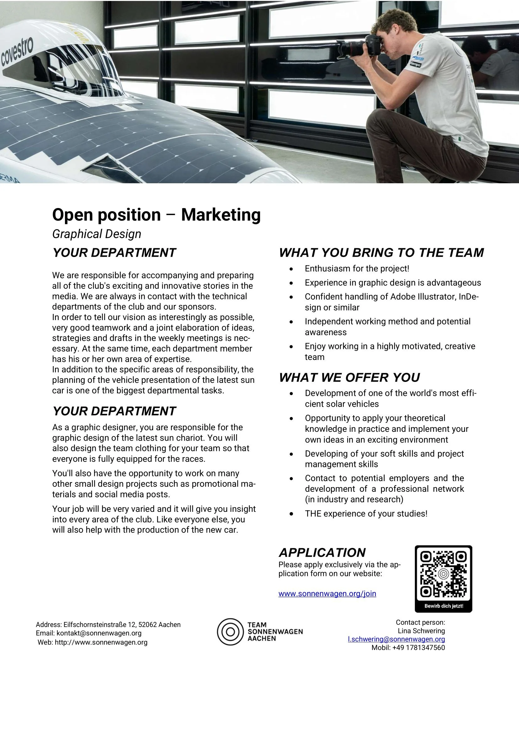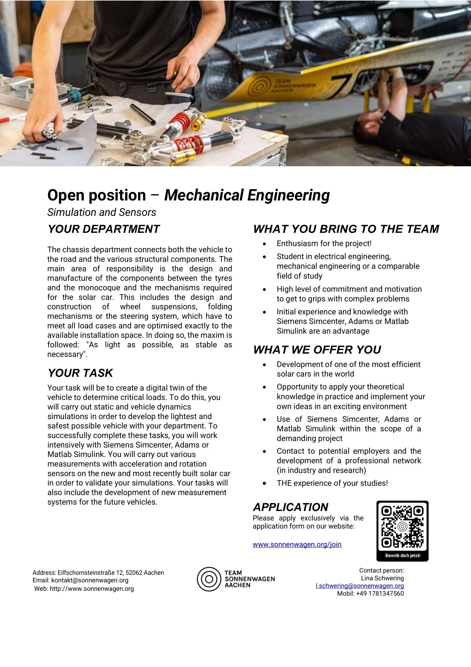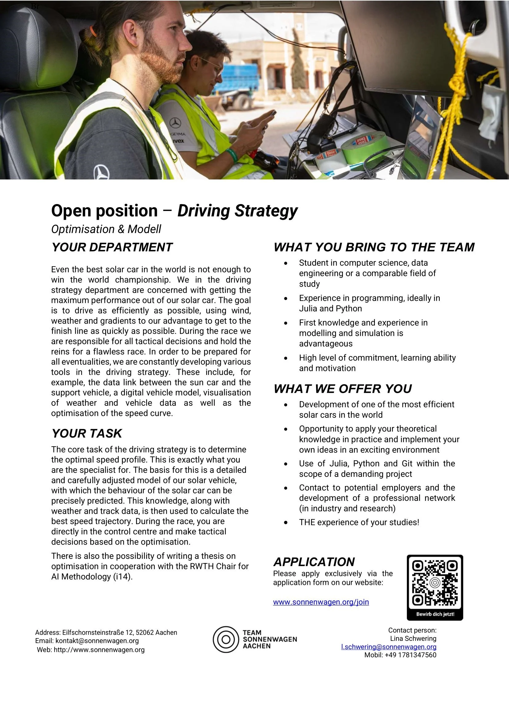 You are a student at RWTH Aachen University or FH Aachen? You are interested in electromobility and solar energy and want to help shape your future? You are committed and can work excellently in a team? You have a good basic knowledge of the relevant field of interest? We could convince you of our project? Then apply today and become a member of the movement.